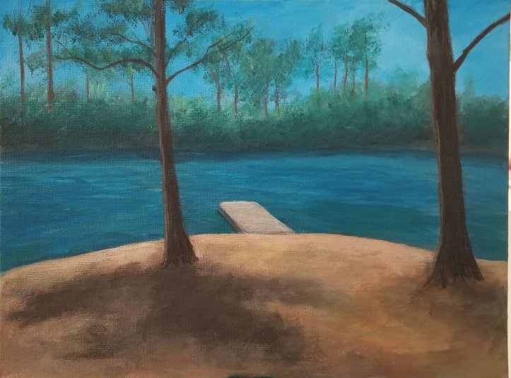 Update: I’ve just finished my first round of tweaking of my pond painting. And although I worry it looks more like a tropical lagoon than a Virginia pond at this point, I feeling better about how it’s turning out.