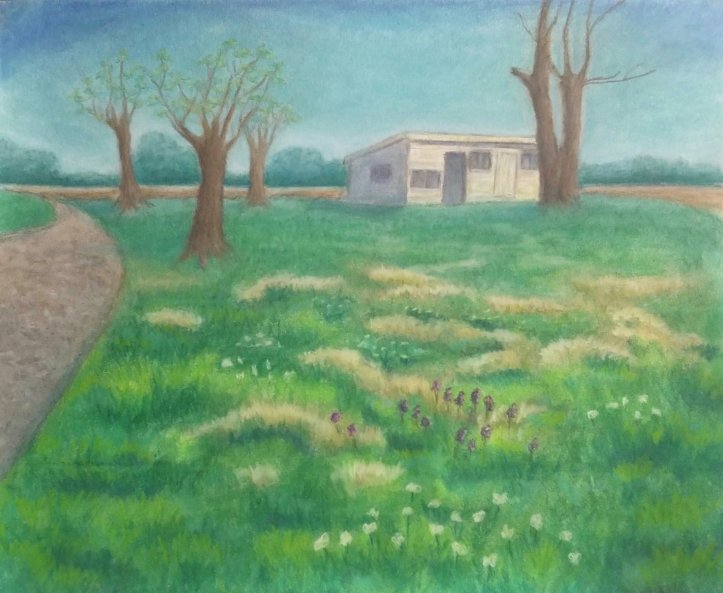Each week, our Plein Air efforts have been challenged by things we forgot to bring, weather, and of course lack of practice. Yesterday was no different. It was VERY windy, so much so that I decided right away that trying to keep things from flying away off my stand-up easel and paints from drying out on palette and brush would be nearly impossible. Luckily, I’d also brought my soft (chalk) pastels with me.