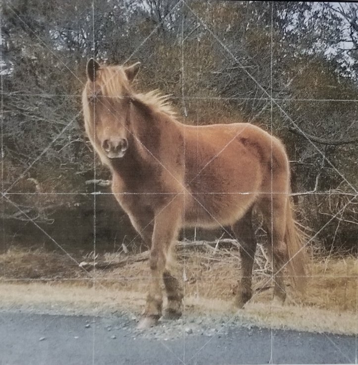 At the art class I attended two days ago, the instructor taught us an easy way to graph a photo to sketch it. First, you find the middle point of the photo. You draw a line vertically and then horizontally through it, then from corner to corner, diagonally. Then you draw a diamond connecting the outer points of the vertical and horizontal lines, then you draw vertical and horizontal lines through the points where the diamond lines and diagonal lines cross. Sounds complicated, but it was really easy, and as the instructor pointed out, you only have to measure for the first set of lines. Here’s my gridded pony photo (printed on my home printer on regular printer paper):