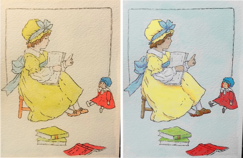 In the watercolor on the left, I was trying to stay true to the muted colors of the original art in the Mother Goose book. On the right, I didn’t worry about staying true to the original, Instead, as I got the hang of it, I had fun with layering the colors.