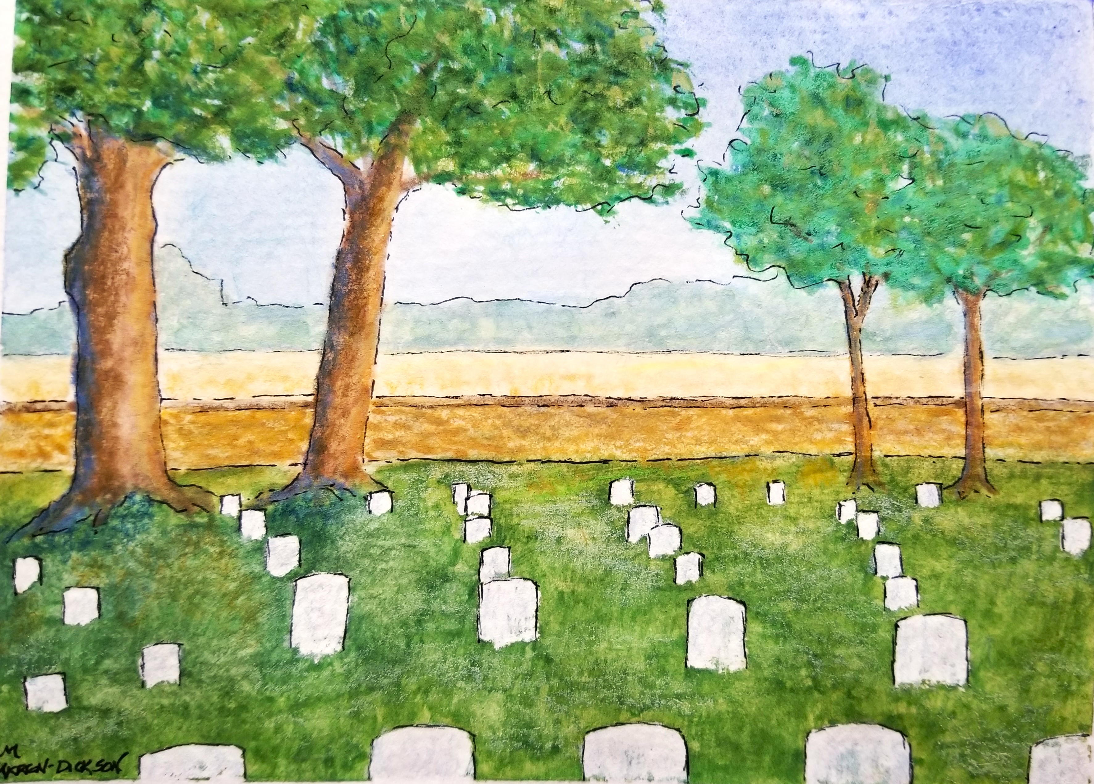 I still thought it lacked something, so I reached for a 03 Pigma Micron pen and lightly sketched over the edges in the painting, especially around the headstones. Below is the final result:
