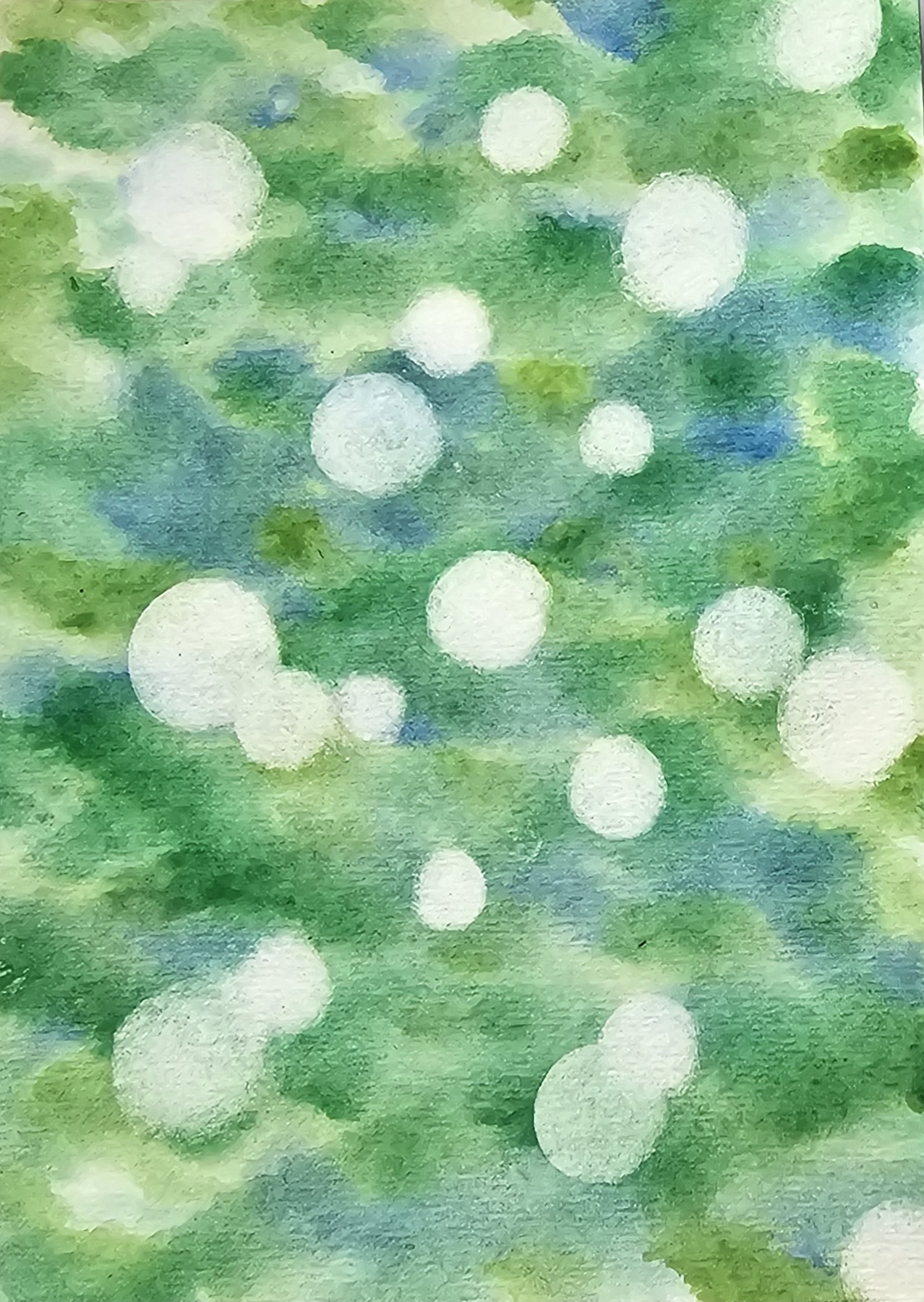 Conclusion: my attempt at the Bokeh effect worked and didn’t work–I was able to lift the paint off to create the Bokeh circles but clearly I didn’t do it right–more practice (and maybe rewatching a video or two) is needed. At the very least, I think I should have made more and smaller circles.