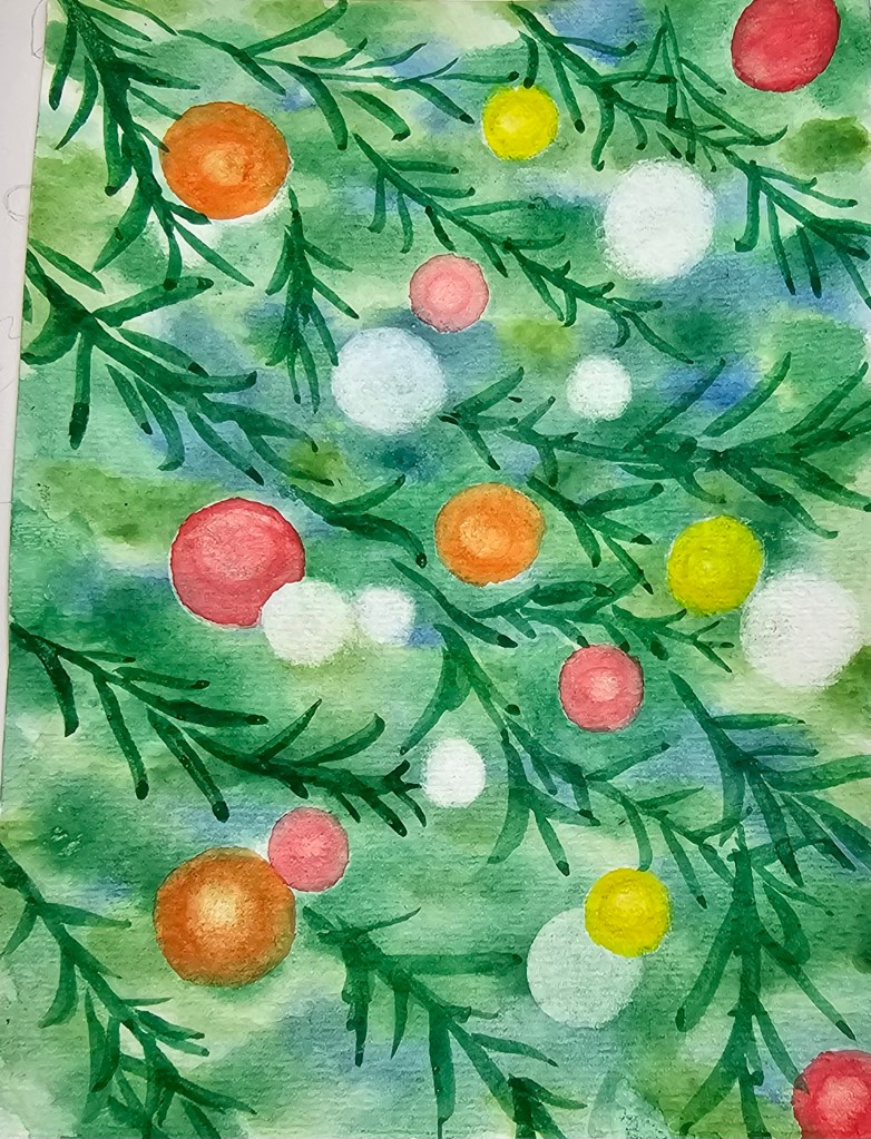 I wanted to give it a try, so today I decided to practice with a small watercolor painting of part of a Christmas tree. The Bokeh effect would suggest the blurred lights on the tree.