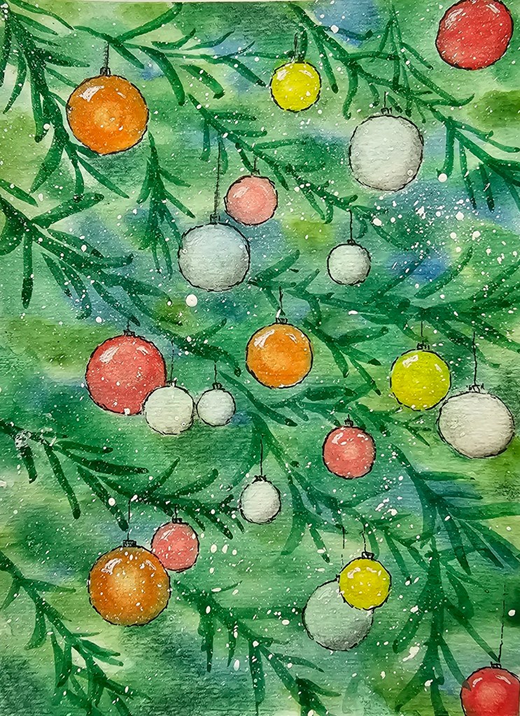 I know, snow on a Christmas tree? It’s now become an outdoor tree. I like the effect of the snow, but it still didn’t look finished. So, I got out a waterproof pen and lightly outlined the balls and drew lines above them to suggest hangers. To finish it off, I used a white gel pen to create brighter highlights on the color balls: