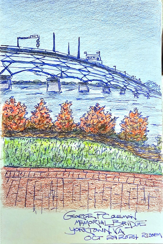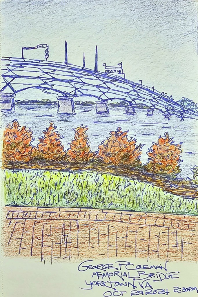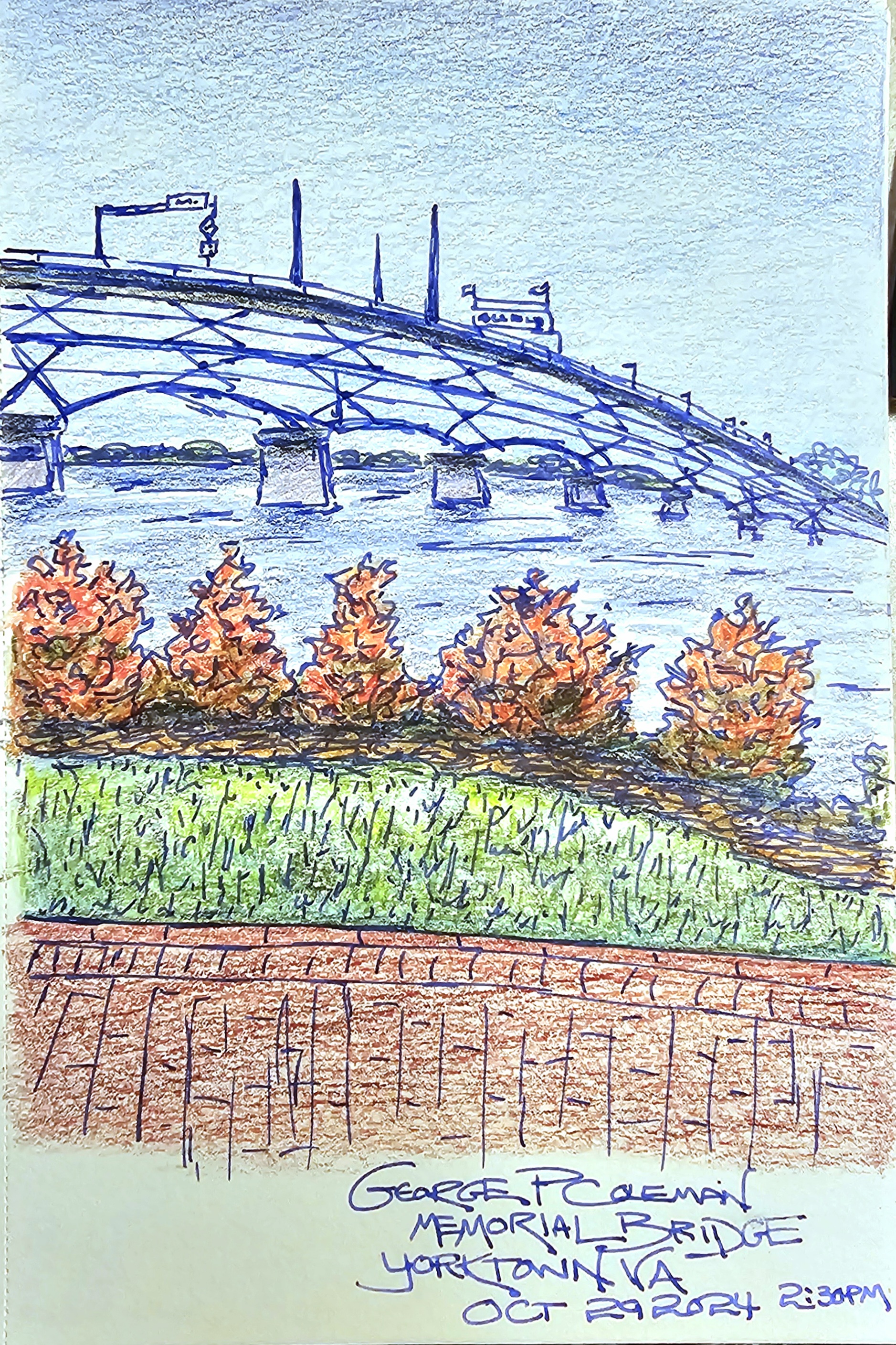 Somehow I managed it, sketching with a pen. And while the results weren’t great, they weren’t too awful either–it was recognizable as a scene with a bridge anyway.