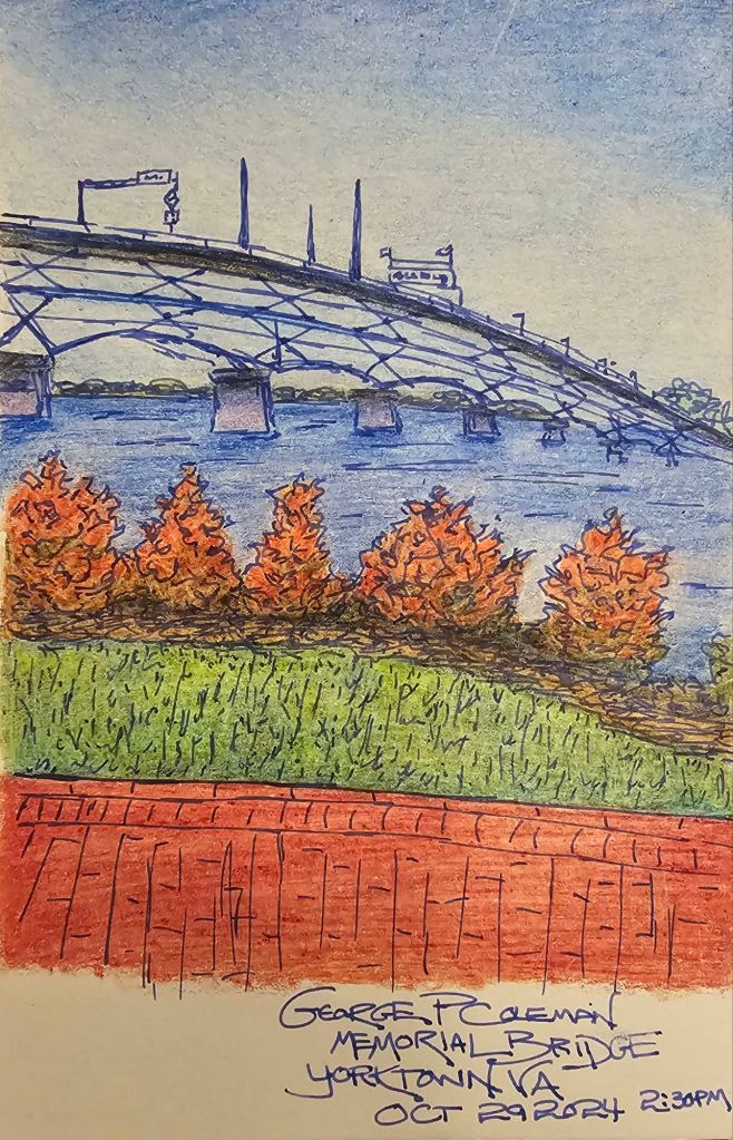 The other day I went through my sketchbook and came upon the bridge sketch. I decided to try to make the colors more intense, so I pulled out my Prismacolor pencils and applied another layer of color, but the waxy buildup from the first layer limited how much color was taken up by the paper.