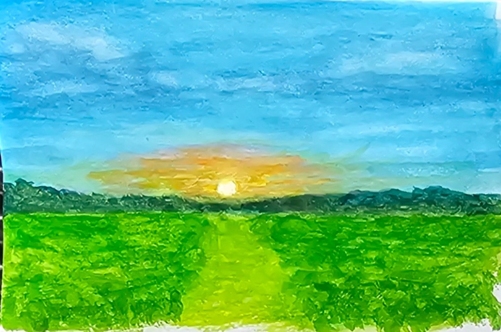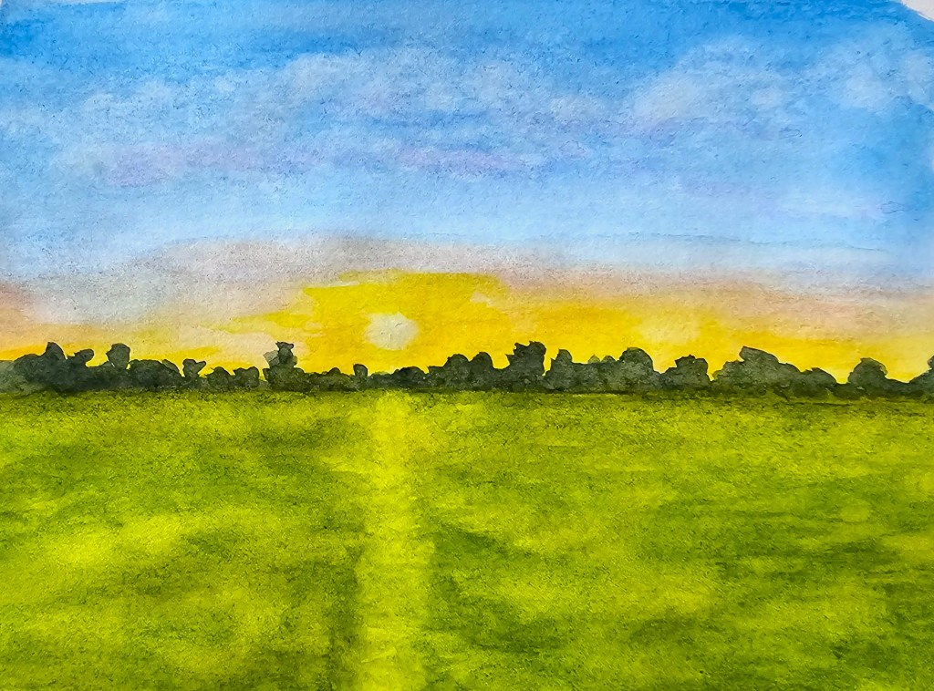 I then switched over to watercolors and painted another mini landscape (see below). As I struggled with it, I was reminded that paper that’s not made for watercolors can make using them a struggle–the paper warps and the watery paint tends to sit on top of the paper, not being absorbed like it should. The water brushes were another problem–their stiff nylon bristles were often lifting off more color than they were putting down. And then there was the bad decision making–I tried to blend a more natural looking green for the grass but ended up with a muddy, dull color.